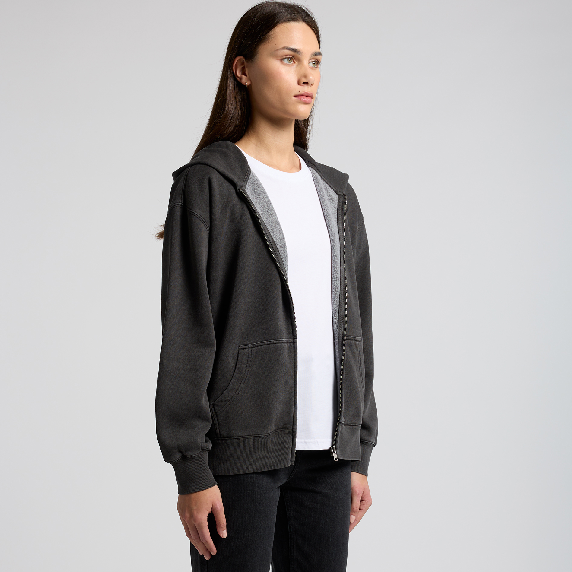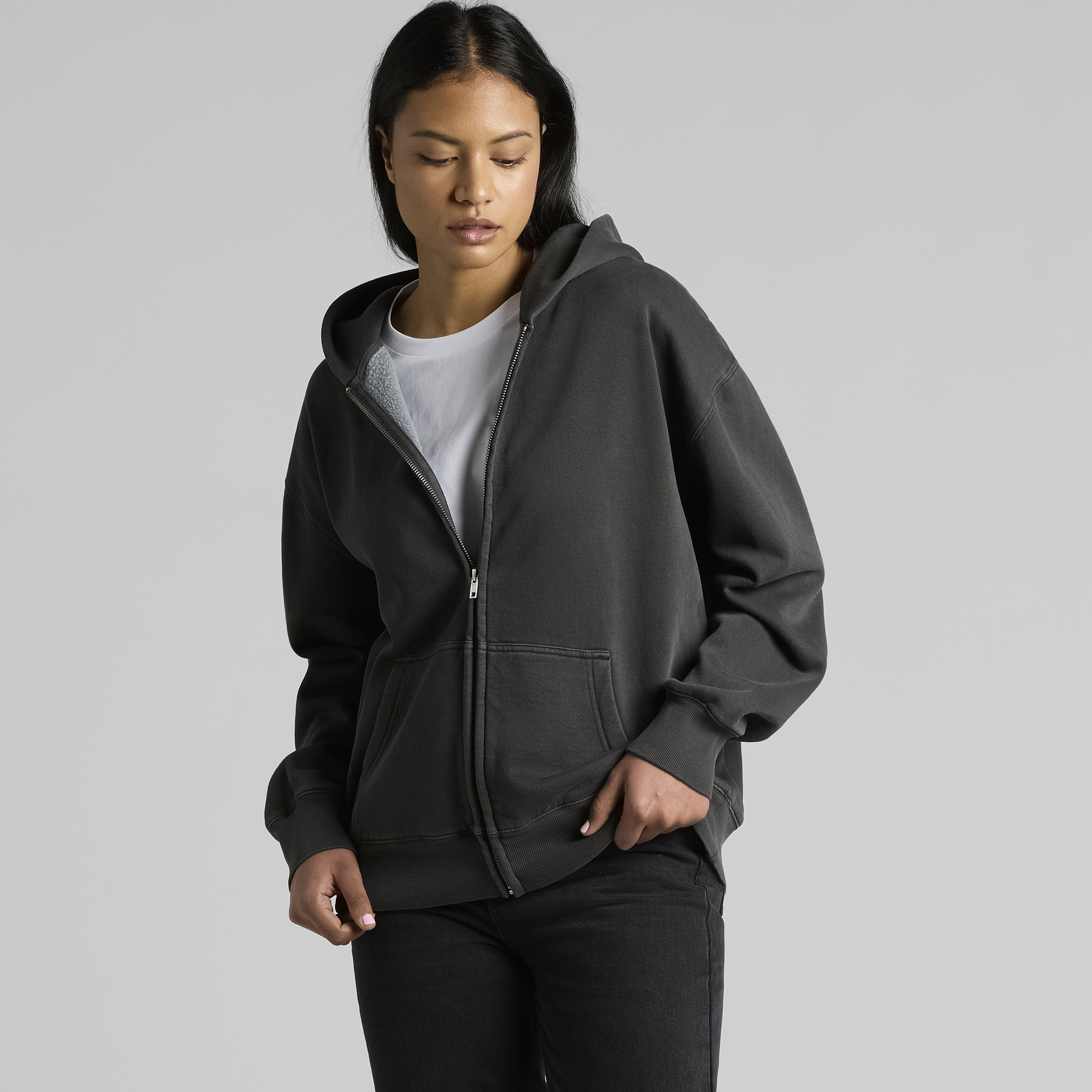 Construction: Garment dyed, zip hood, drop shoulder, kangaroo pocket, self-fabric lined hood, no drawcord, SBS two-way zip, sleeve cuff ribbing, CVC fleece, preshrunk to minimise shrinka